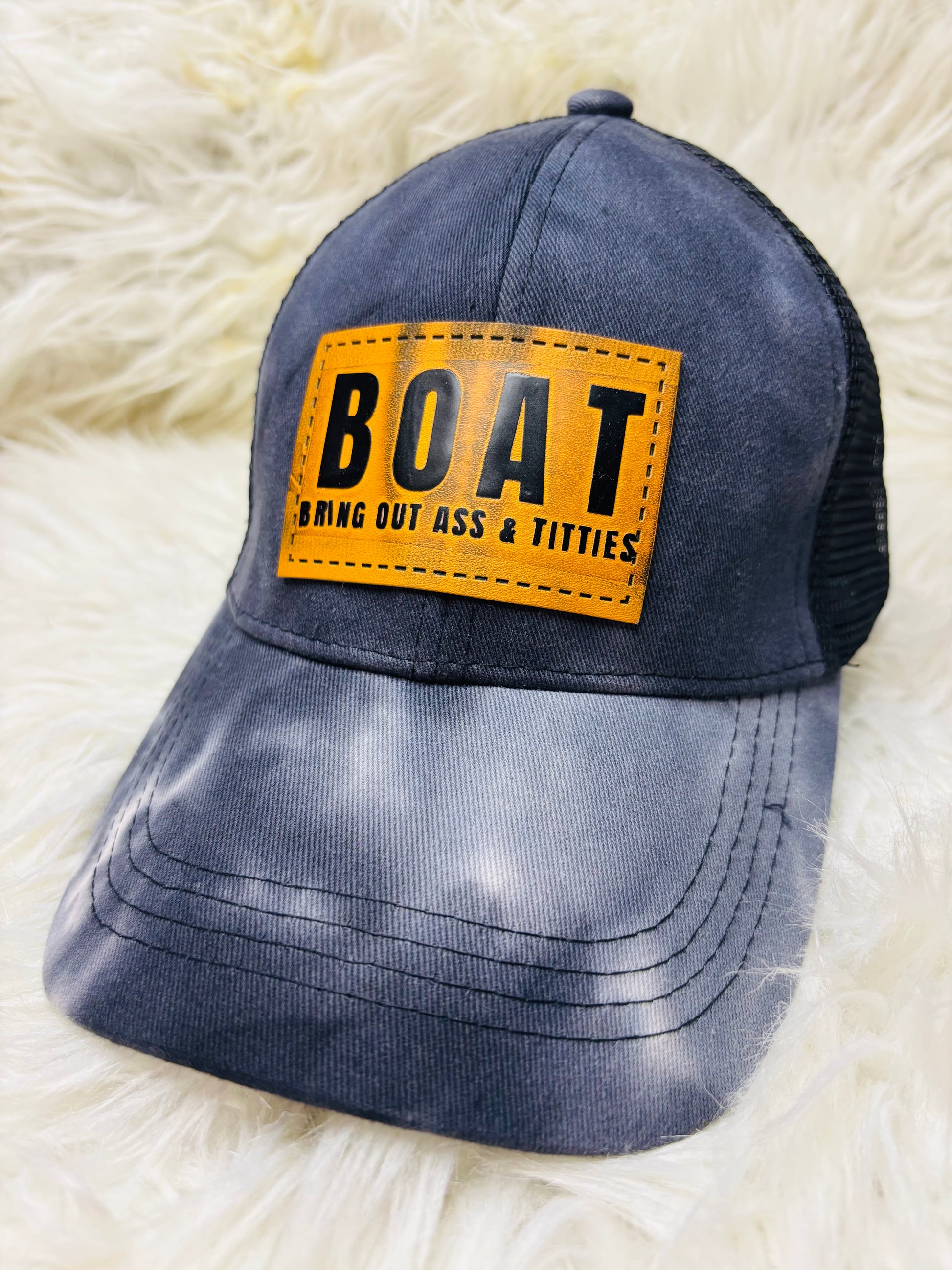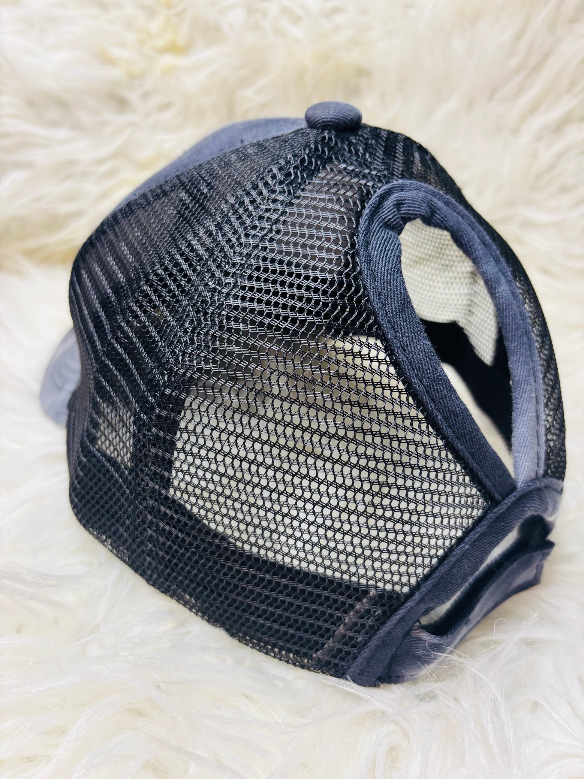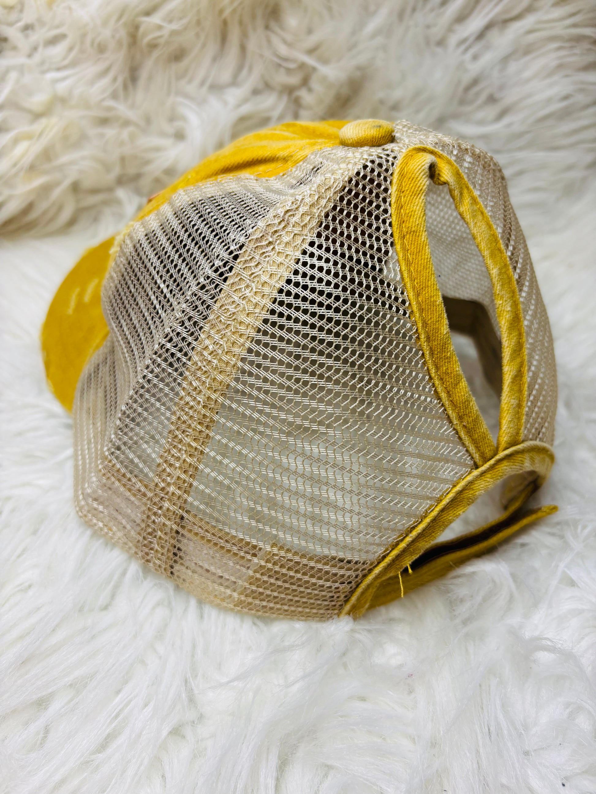 Pony tail hat. Available in black tie dye and distressed yellow with leather patch.