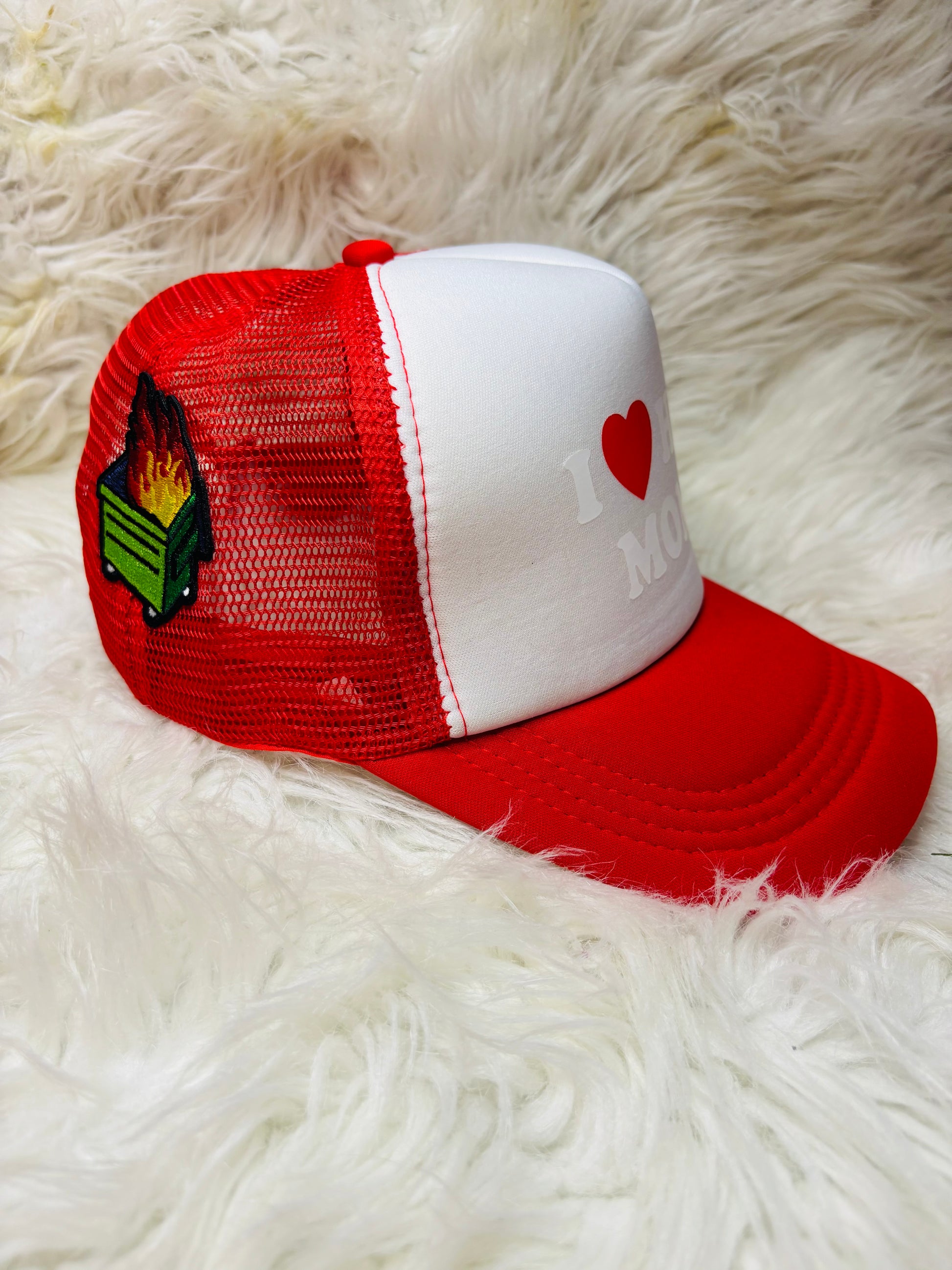 red multi color trucker hat. Available in 2 different styles. Black mesh or red mesh