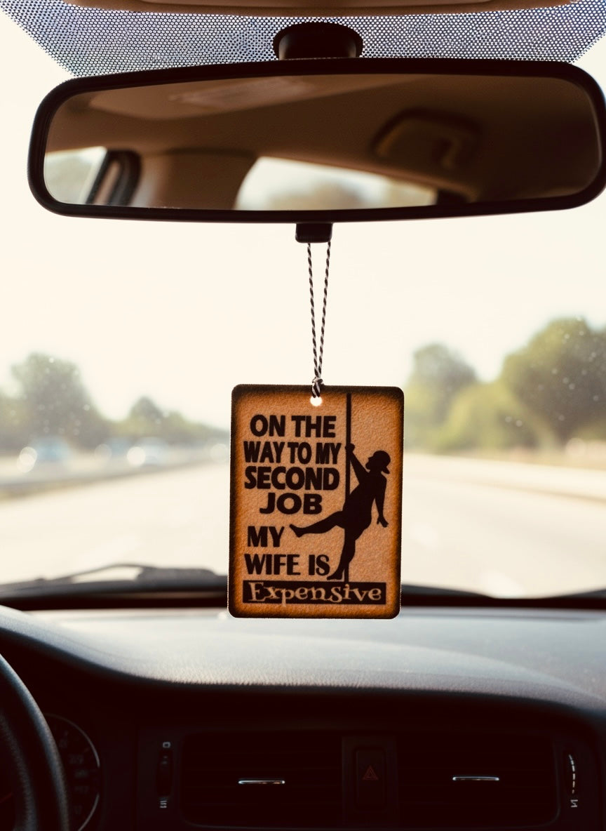 On my way to my second job. Felt car freshie. Includes 2 FREE scent bottles 5 ML each.Includes 2 Free scent spray bottle 5 ML each. Fragrance options are Lavender, Strawberry, Vanilla, Black Ice, Love Spell, Apple Blossom, & Stress Releif. Please message me through the website once your orders is placed to let me know which fragrances you would like.