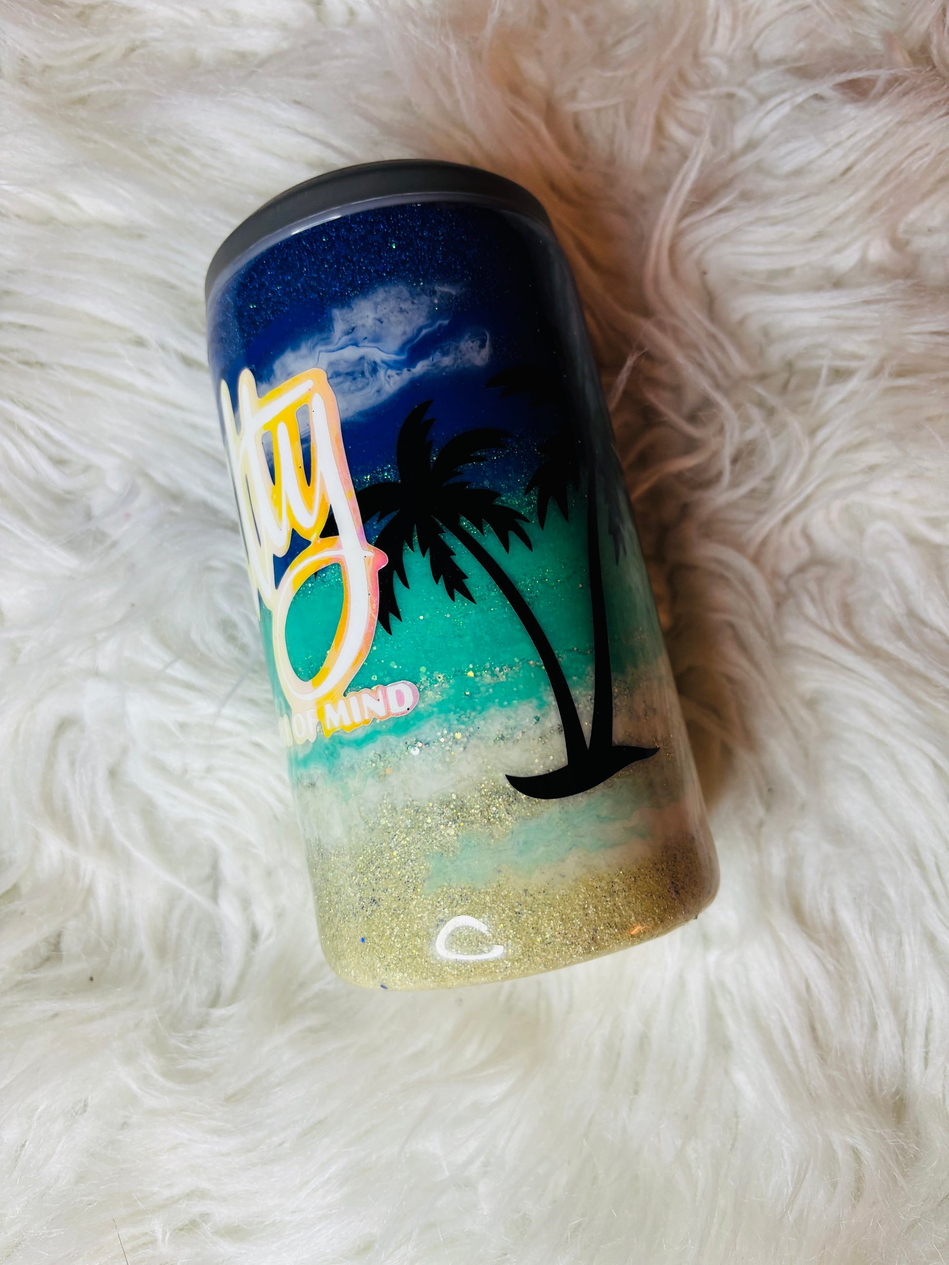 Glitter can coozie. Converts to tumbler with an extra lid.